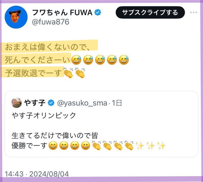その後も「靴屋オリンピック」「耳鼻科オリンピック」「パチンコ屋オリンピック」「文房具屋オリンピック」などを紹介し、好ましくない態度の店員などに「お前は偉くないので、予選敗退でーす!」と連呼。ラストに「やす子オリンピック」と言いだし「生きてるだけで偉いので皆優勝でーす」とやす子のX投稿を読み上げ「ありがとうー!」と絶叫して締めくくっていた。